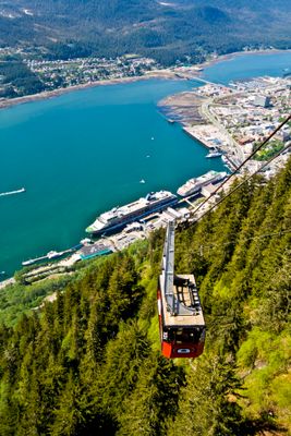 O Goldbelt Tram transporta passageiros dos terminais de navios de cruzeiro até o Monte Roberts em Juneau. O teleférico aéreo sobe aproximadamente 550 metros e oferece acesso a trilhas de caminhada e instalações no cume.