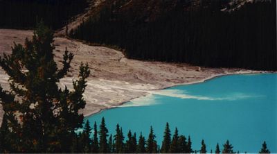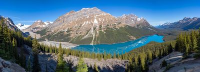 Peyto Lake é um lago glacial localizado no Parque Nacional Banff, situado nas Montanhas Rochosas canadenses com águas de cor turquesa muito característica. A cor da água vem de partículas finas de rocha criadas pela ação do glaciar que ficam em suspensão.