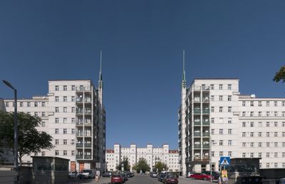 O complexo residencial Friedrich-Engels-Platz abriga mais de 1.400 apartamentos distribuídos em vários edifícios com torres características e sacadas decoradas. O espaço se organiza em torno de pátios centrais que conectam as diferentes seções do conjunto.