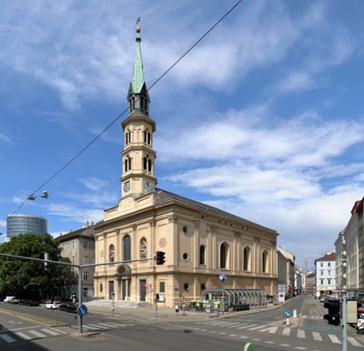 A Igreja Johann Nepomuk é uma igreja paroquial no bairro Leopoldstadt em Viena com uma torre sineira distintiva e elementos neoclássicos em toda a sua estrutura. O edifício apresenta características típicas do século 19 com um interior simples e uma fachada externa limpa.