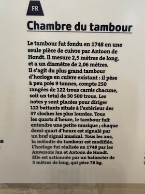 A torre se inclina levemente para o leste, dando-lhe uma inclinação distintiva visível da praça abaixo. Após o incêndio de 1741, 26 sinos novos foram fundidos e instalados, muitos dos quais ainda estão em uso.