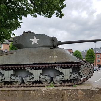 O Regimento belga 1/3 Lanceiros instalou este tanque em 2004 para marcar o 60º aniversário da Batalha das Ardenas e da libertação de La Roche-en-Ardenne. O memorial homenageia a contraofensiva de janeiro de 1945 quando as forças aliadas repeliam a ocupação alemã.