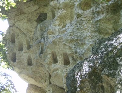 Os visitantes podem ver nichos trapezoidais, circulares e retangulares esculpidos diretamente nas faces rochosas, revelando como os antigos moldaram este santuário. Duas câmaras funerárias na base ocidental mostram que o local servia para rituais e sepulturas.
