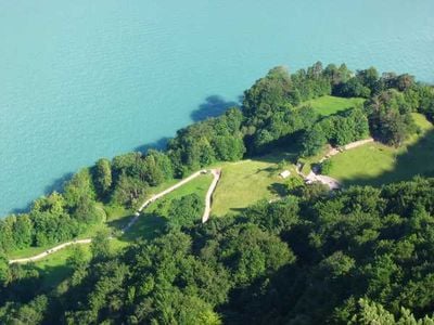 O prado Rütli estende-se pelas encostas próximas ao lago Lucerna, cercado por montanhas que proporcionam vistas da paisagem alpina circundante.