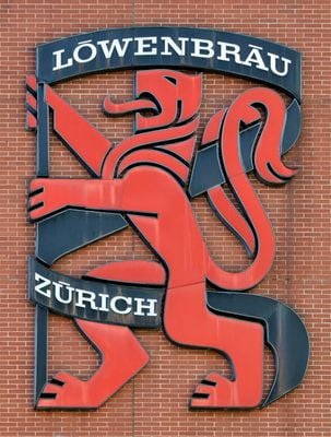 O complexo Löwenbräu inclui dois edifícios modernos elevados, chamados Preto e Vermelho, com fachadas em placas cerâmicas ao lado de estruturas industriais.