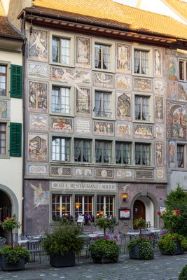 Adler house, building with wall painting and restaurant in Stein am Rhein in the canton of Schaffhausen, Switzerland