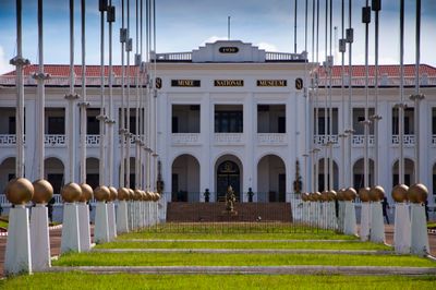 O Museu Nacional exibe máscaras tradicionais, vestimentas, instrumentos musicais e esculturas dos diversos grupos étnicos de Camarões em um antigo palácio presidencial.