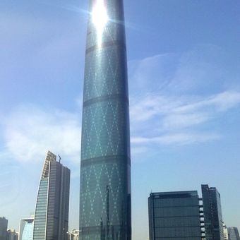 O Centro Financeiro Internacional de Guangzhou eleva-se por 440 metros com 103 andares acima do solo e apresenta uma estrutura em diamante com fachadas de vidro e aço.