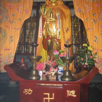 O Templo Hanshan abrange 13.000 metros quadrados com um salão principal contendo uma estátua dourada de Sakyamuni sobre um trono de mármore.