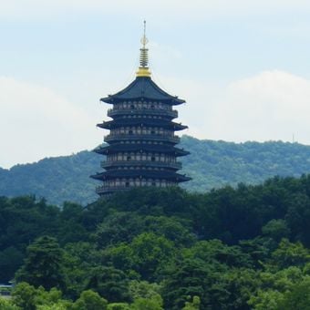 A Pagoda Leifeng é uma estrutura octogonal de cinco andares que se ergue 72 metros acima do West Lake, com elementos de cobre e estrutura de aço concluída em 2002. O edifício inclui dois elevadores internos que permitem aos visitantes acessar múltiplas plataformas de observação em toda a sua altura.