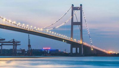 A ponte de Jiangyin se estende por 3.071 metros sobre o rio Yangtzé, com um vão principal de 1.385 metros e torres de concreto que alcançam 190 metros de altura.