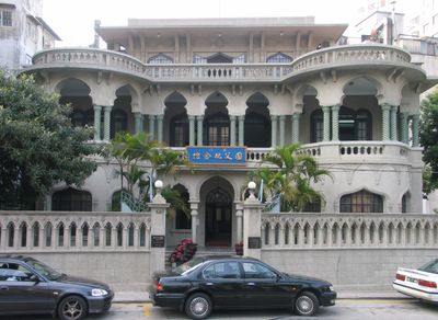 O edifício incorpora elementos arquitetônicos das tradições chinesa e portuguesa, incluindo balaústres entalhados e azulejos decorativos.