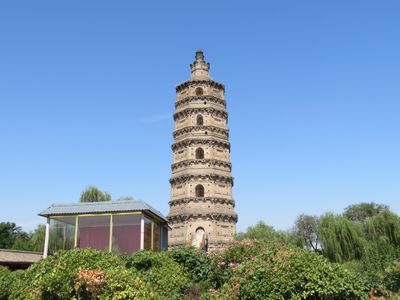 A Pagoda Haotian é uma torre de cinco andares com forma octogonal que se eleva aproximadamente 36 metros de altura no distrito de Fangshan. Cada nível apresenta quatro portas alinhadas com os quatro pontos cardinais que organizam o espaço interior.