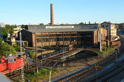 O Museu Ferroviario de Dresda exibe uma colecao de locomotivas a vapor, guinchos de trilho e equipamentos tecnicos em um antigo deposito ferroviario reformado. O sitio conserva porcoes da infraestrutura original de quando funcionava como instalacao ferroviaria ativa.