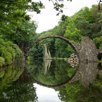 O parque apresenta a Ponte Rakotz, construída entre 1863 e 1882, que cria um reflexo circular perfeito na superfície da água.