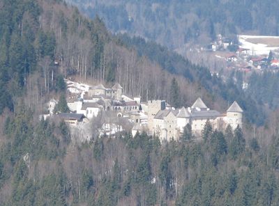 O castelo de pedra ergue-se em uma encosta a 50 quilômetros ao sul de Munique, com vista para o lago Tegernsee e os Alpes bávaros.