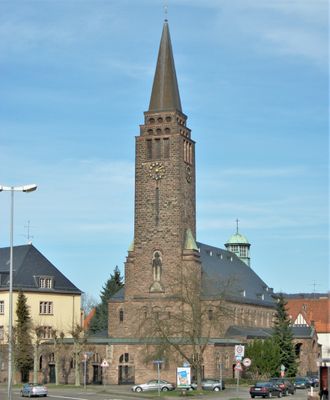 A igreja Christkönig e uma basilica de tres naves construida com arenito vermelho-amarelo nao rebocado no distrito de St. Arnual. A estrutura abriga aproximadamente 1.650 visitantes e combina caracteristicas de design romanico e bizantino com uma torre imponente.