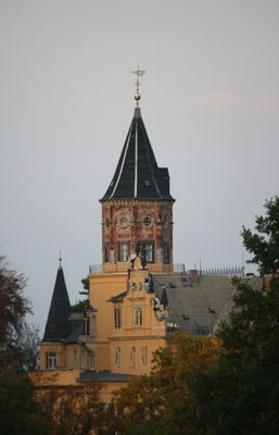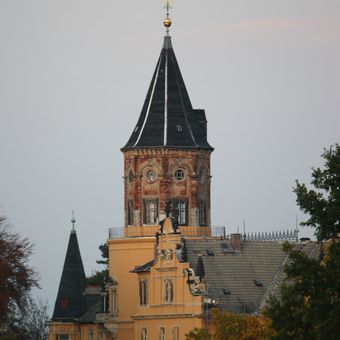 O castelo ergue-se em uma localização estratégica em uma colina, apresentando elementos arquitetônicos neo-renascentistas e neo-barrocos de sua reconstrução de 1878-1880.