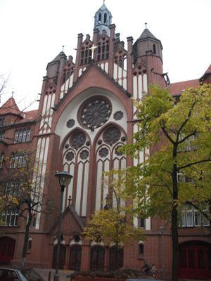 Max Hasak projetou a estrutura no início do século XX, com a construção concluída em 1912 como igreja filial para o bairro em expansão. O edifício reflete a linguagem arquitetônica gótica dessa época no contexto de Berlim.