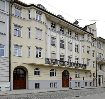 O edifício está localizado no distrito de Maxvorstadt, facilmente acessível por transporte público. A unidade continua atendendo pacientes que procuram tratamentos médicos hoje.
