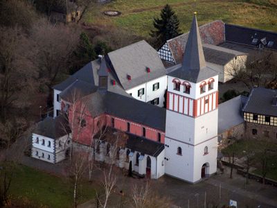 A Igreja de São Pancrácio é um templo católico romano em Oberpleis com uma fachada de pedra impressionante e elementos de design tradicional. O edifício exibe janelas em arco arredondado, uma torre maciça e trabalhos em pedra esculpida visíveis tanto no exterior quanto nos espaços interiores.
