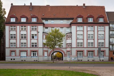 O edifício Brüggemannhof incorpora elementos arquitetônicos alemães tradicionais com características residenciais e de preservação histórica.
