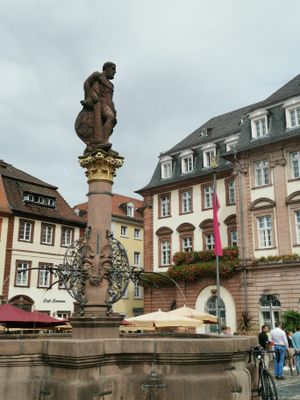 A Fonte de Hércules é uma fonte de pedra na Praça do Mercado com uma figura mitológica em pé em uma coluna central. A estrutura exibe elementos de design barroco e se localiza em frente à Prefeitura de Heidelberg.