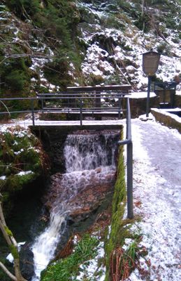 A trilha Harzer Hexenstieg atravessa a cachoeira por uma ponte, seguindo o caminho da antiga rota comercial Magdeburger Way.