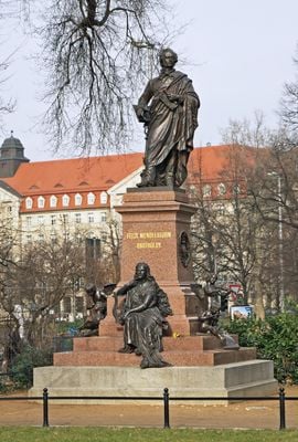 O monumento de 6,8 metros apresenta Felix Mendelssohn Bartholdy sobre um pedestal de granito, segurando uma batuta e um rolo de partituras.