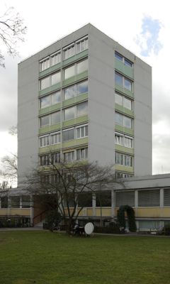 Jugendzentrum Frankenhof, um einen Hof gruppierte Anlage mit Hochbau und ein- beziehungsweise zweigeschossigen Flügeln und Hallenbad, Stahlbetonskelettbauten mit Flachdach, nach Plänen von Werner Wirsing und Hans-Georg Schulz, 1960-63