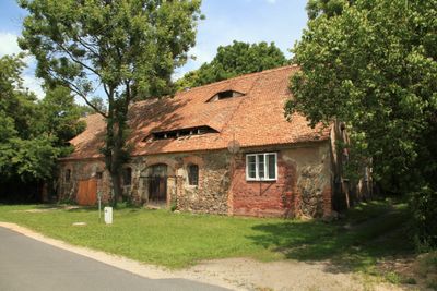 Einzeldenkmale der Sachgesamtheit Rittergut Horka: Stallscheune des ehemaligen Gutshofes Am Gemeindeamt 4, stattlicher Baukörper mit markantem Dach, baugeschichtlich und ortsgeschichtlich von Bedeutung