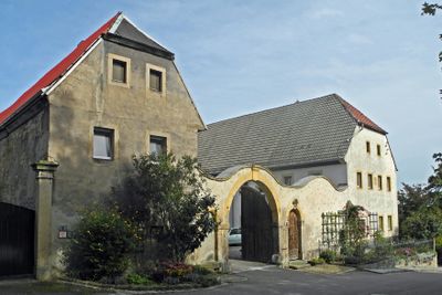 Wohnstallhaus und Torbogen eines Bauernhofes Eutschützer Straße 1