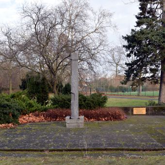 Denkmal Stahlarbeitermarsch, memorial by Barna von Sartory on Berliner Straße in Berlin-Tegel, Germany, consisting of a memorial stele and plaque