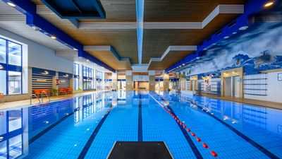 A instalação apresenta uma plataforma de mergulho de três metros sem piscina separada, complementada por blocos de partida e um trampolim de um metro.