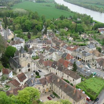 La Roche-Guyon é uma aldeia ao longo do Sena em Val-d'Oise, onde edifícios de pedra calcária branca se apoiam contra penhascos de giz coroados por um complexo de castelo. A fortaleza combina estruturas medievais com acréscimos posteriores e se eleva de forma proeminente sobre a paisagem circundante.