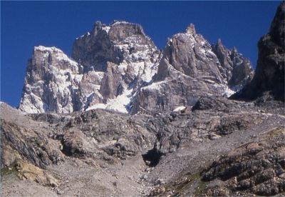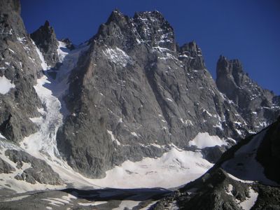 Três geleiras distintas circundam a montanha: o Glacier Noir no lado norte, mais o Glacier du Coup de Sabre e o Glacier de Sialouze nas encostas sul.