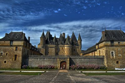 A estrutura do castelo apresenta telhados altos com cones, torres e pirâmides decoradas com símbolos senhoriais e alquímicos em suas superfícies exteriores.