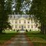 O castelo apresenta arquitetura simétrica com fachadas em pedra, portões de ferro forjado e um pátio central cercado por jardins.