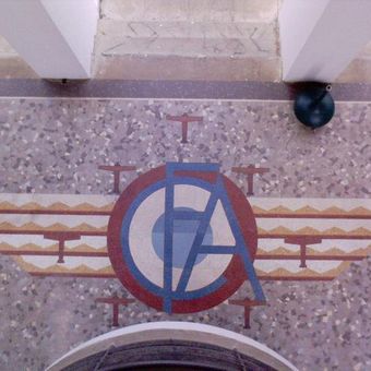 O saguão de entrada contém mosaicos decorativos do artista Isidore Odorico que incorporam padrões tricolores e temas de aviação.