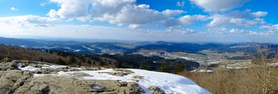 Roche d'Ajoux atinge uma elevação de 970 metros nas montanhas de Beaujolais no departamento de Rhône, apresentando vistas das cadeias montanhosas adjacentes.