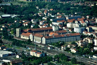 O complexo industrial apresenta arquitetura do século XIX com configuração em H, fachadas em pedra de Volvic e uma chaminé industrial característica.