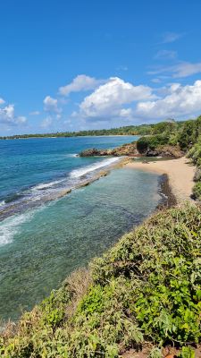 Plage de Clugny fica na costa ocidental de Guadalupe em Sainte-Rose, com areia dourada protegida por uma linha de árvores ao longo da margem. Águas limpas encontram o mar do Caribe em uma inclinação suave, criando um perfil costeiro macio.