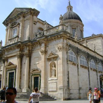 A Catedral de Dubrovnik é um edifício de igreja barroca no coração da Cidade Velha. A estrutura apresenta uma fachada de calcário com janelas em arco, dois campanários flanqueando os lados e uma entrada elevada acessível por uma ampla escadaria de pedra.