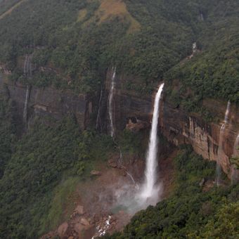 A cachoeira Nohkalikai despenca 340 metros em uma piscina verde, tornando-a a mais alta cachoeira de queda única da Índia.