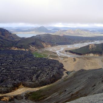 Landmannalaugar é uma região geotérmica no sul da Islândia conhecida por suas montanhas policrômicas que variam do vermelho ao amarelo. A paisagem apresenta numerosas fontes termais naturais e respiradouros de vapor espalhados entre rochas de riolita e depósitos minerais.