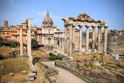 Roma preserva mais de 2.000 anos de história arquitetônica dentro de seus limites, conservando templos e anfiteatros antigos ao lado de igrejas renascentistas e praças barrocas. O Fórum Romano exibe ruínas do século I a.C. ao século IV d.C., incluindo edifícios governamentais e templos que formavam o centro administrativo do Império Romano. O Panteão demonstra a engenharia romana com sua cúpula de concreto, enquanto o Coliseu permanece o maior anfiteatro antigo já construído. A cidade evoluiu ao longo dos séculos, com o patrocínio papal transformando Roma medieval em uma vitrine de arte e arquitetura renascentista e barroca. O Vaticano possui coleções religiosas e artísticas importantes, incluindo a Capela Sistina com os afrescos do teto de Michelangelo e a Basílica de São Pedro, a maior igreja do mundo. Por toda a zona histórica, praças como a Piazza Navona preservam marcas de antigas construções romanas, além de exibirem fontes barrocas de Bernini e Borromini. A Fonte de Trevi atrai milhares de visitantes diariamente, com sua fachada do século XVIII, e a Escadaria Espanhola conecta diferentes elevações da cidade. Os bairros de Roma mantêm o estilo de vida italiano tradicional ao redor desses monumentos, com restaurantes, lojas e residências de diversas épocas históricas.