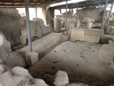 Escavações em 1946 revelaram seis buracos circulares com um no centro, que sustentavam as hastes da estrutura original do século VIII aC.