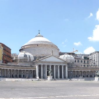 A praça de 25.000 metros quadrados apresenta o Palácio Real de Nápoles e a Basílica de São Francisco de Paula com sua colunata curva.