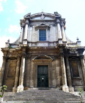 San Nicola da Tolentino agli Orti Sallustiani e uma igreja barroca no bairro de Trevi com uma fachada de dois andares decorada com pilares e colunas. Uma escadaria imponente leva ao portal principal e se abre para varias capelas e artefatos religiosos no interior.