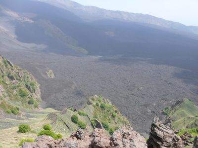 O Valle del Bove é um cratere colapsado na encosta leste do Etna, formando um grande vale cercado por paredes íngremes. O fundo do vale é coberto por fluxos de lava recentes, e duas formações rochosas cobertas de vegetação se erguem sozinhas na paisagem vulcânica estéril.